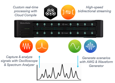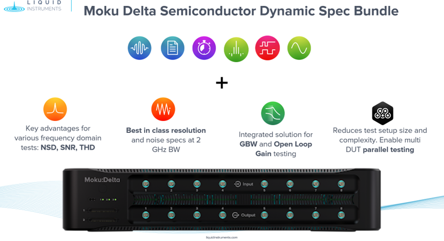 Example: Semiconductor From dynamic performance testing to parallel device evaluation, Moku:Delta brings speed and flexibility to demanding semiconductor test environments. Key Advantages • Best-in-class signal integrity — 0 Hz to 2 GHz bandwidth, low noise, high resolution (14-bit outputs, 14- & 20-bit blended ADCs) • Higher throughput — Multi-instrument Mode enables simultaneous testing on 8 input and 8 output channels • Faster development — standard APIs and flexible routing minimize test setup overhead • Lower costs — reduced fixturing, switching, and cabling in a compact, 2U rack-mountable chassis | |